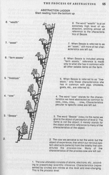 The idea here is relatively simple: every concrete object of experience — a cow, a pen, a slice of pizza — can be referenced at different levels of abstraction in a continuum that runs from “concrete” to “conceptual.” Hayakawa illustrates this with the example of a cow. If, as I drive through farmland on my way to work, I see a cow in the field, I may think to myself: “hey, there’s a cow, how bucolic and pretty.” I see a specific cow with specific features, doing a specific thing in a specific moment, and I have a reaction. Simple. The linguistic part of the experience is that I observe a cow and think “cow.” That’s pretty concrete, so we might say that I’m just a couple of rungs up the ladder of abstraction and nowhere near the top. (I could park my car, walk up to the cow, discover a nametag on its cowbell that says “Bessie” — and now I’m processing this bovine object of my experience at, ladder-wise, a lower and even more concrete level.)